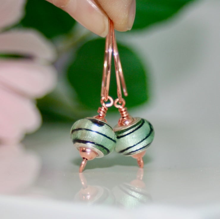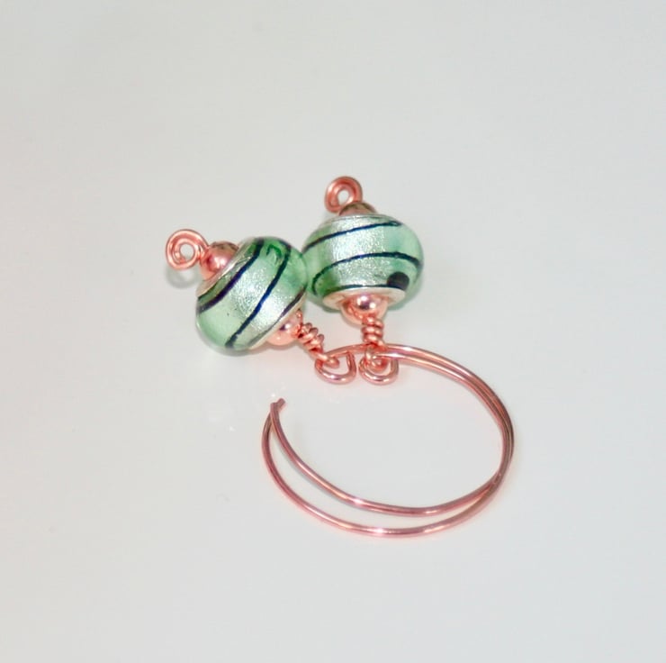 A pretty pair of hoop earrings made with foiled mint green glass beads with a black spiral decoration.