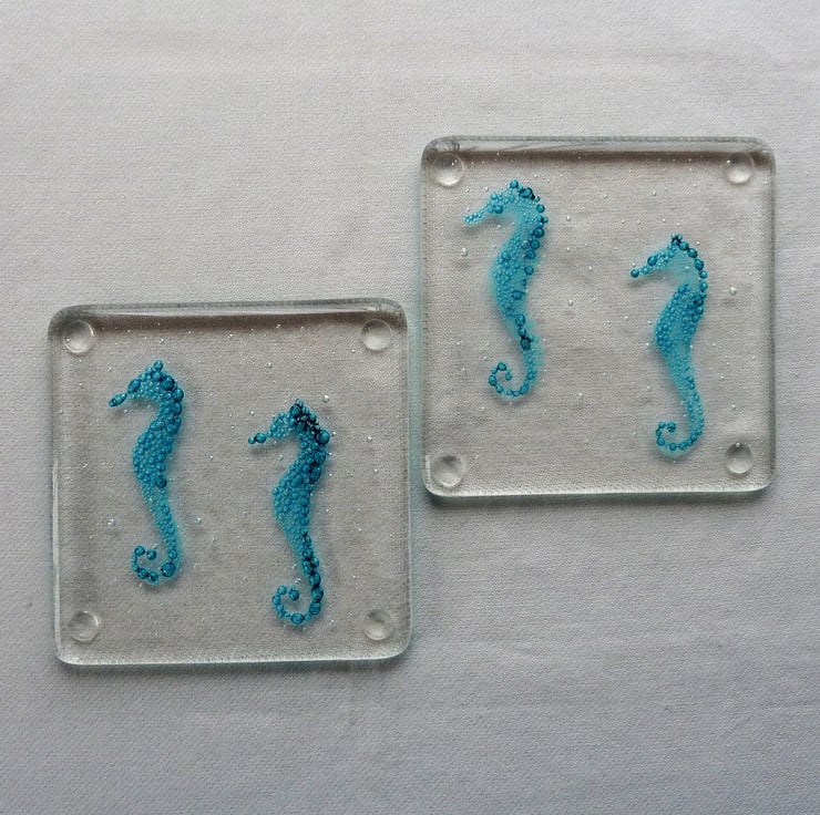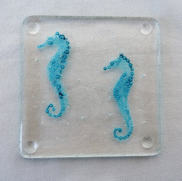 This is a set of two fused glass coasters, each featuring a picture of two seahorses drawn in small blue bubbles.