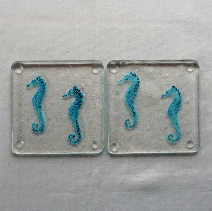 This is a set of two fused glass coasters, each featuring a picture of two seahorses drawn in small blue bubbles.