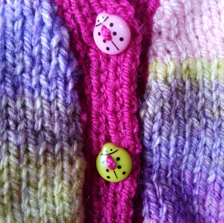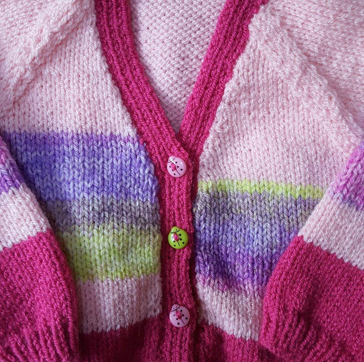 I hope you will love this beautiful soft pink pastel baby cardigan as much as I do. Hand knitted in a warm, soft-feel acrylic yarn with pretty shades of pink, pale green and heather, this gorgeous little v-neck cardigan is handmade to fit an 18" chest, 10.5" back length and 7" sleeve, approximately 6 to 9 months.The rib is knitted in a deep pink for contrast and the four little ladybird buttons complete the look. This little cardigan would make an ideal gift for baby.
