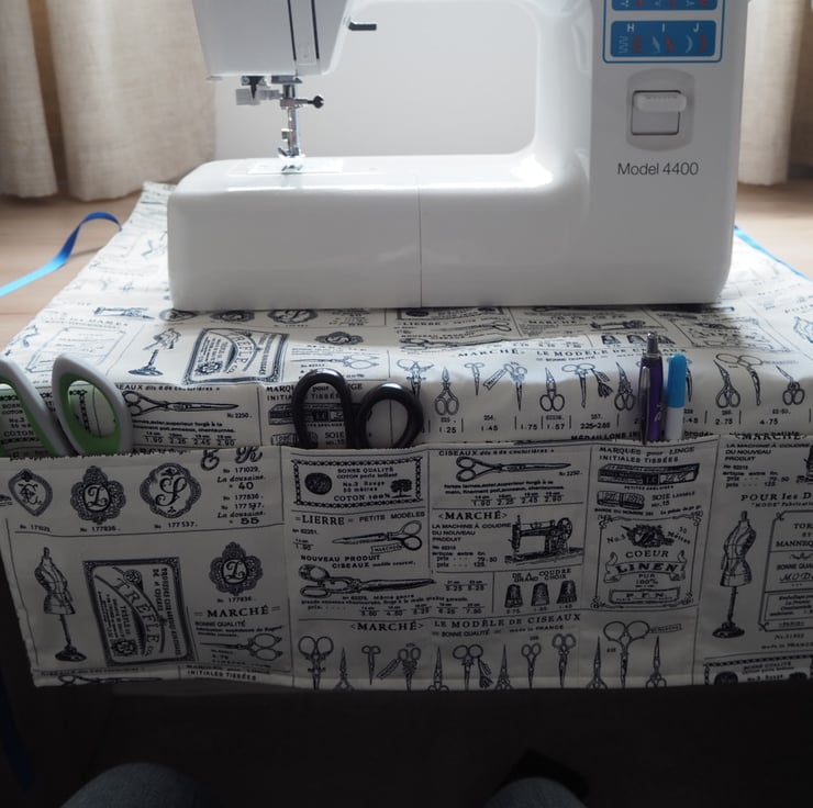 A protective cover for your machine when not in use, with ties made from beautiful blue ribbon at the sides to keep the cover secure, and pockets of various sizes to store your machine and sewing accessories.