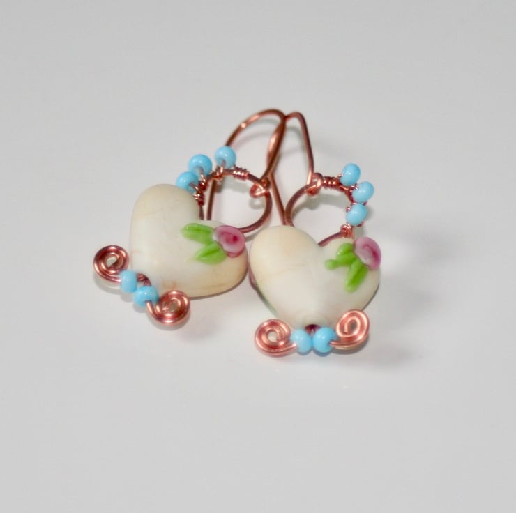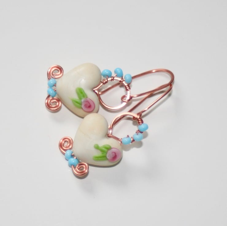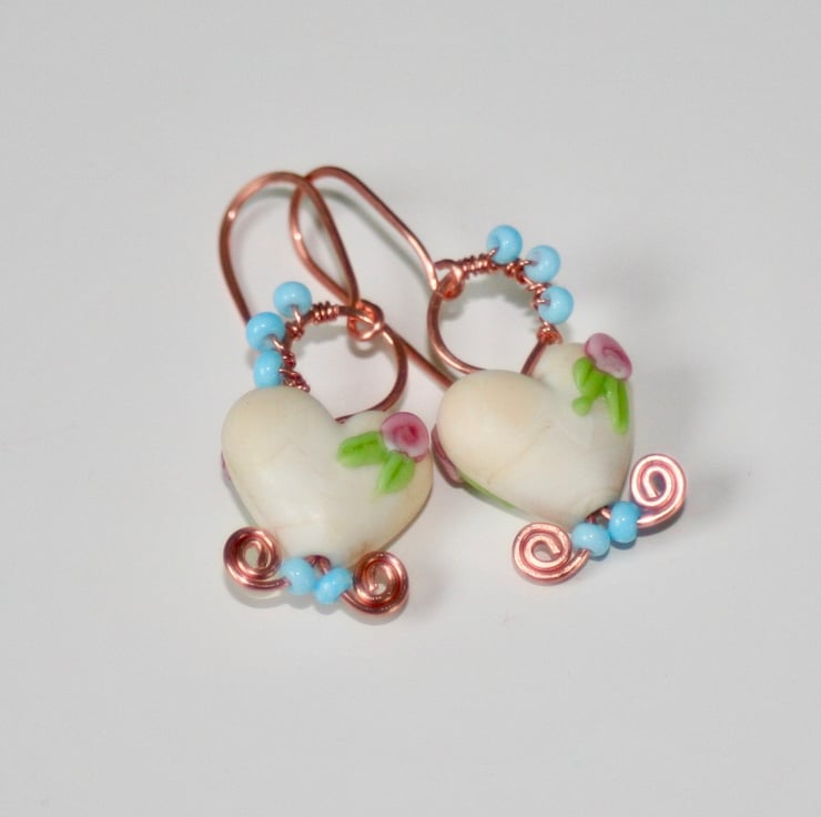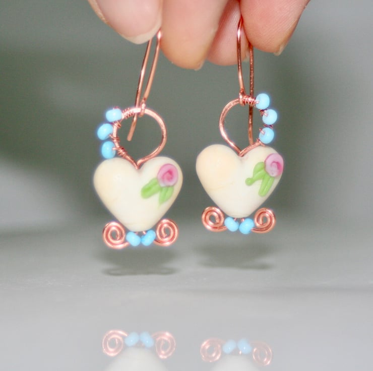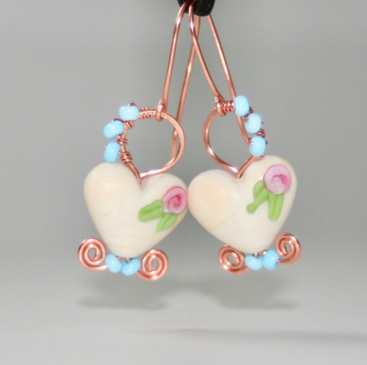 A delicate pair of earrings made with off-white lampwork glass hearts (Josephine Wadman) each decorated with a pretty flower.