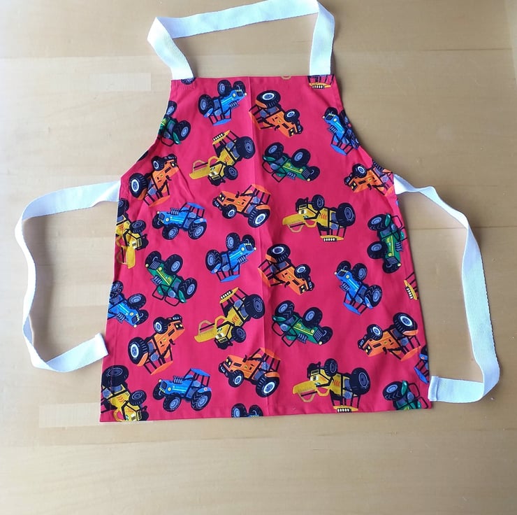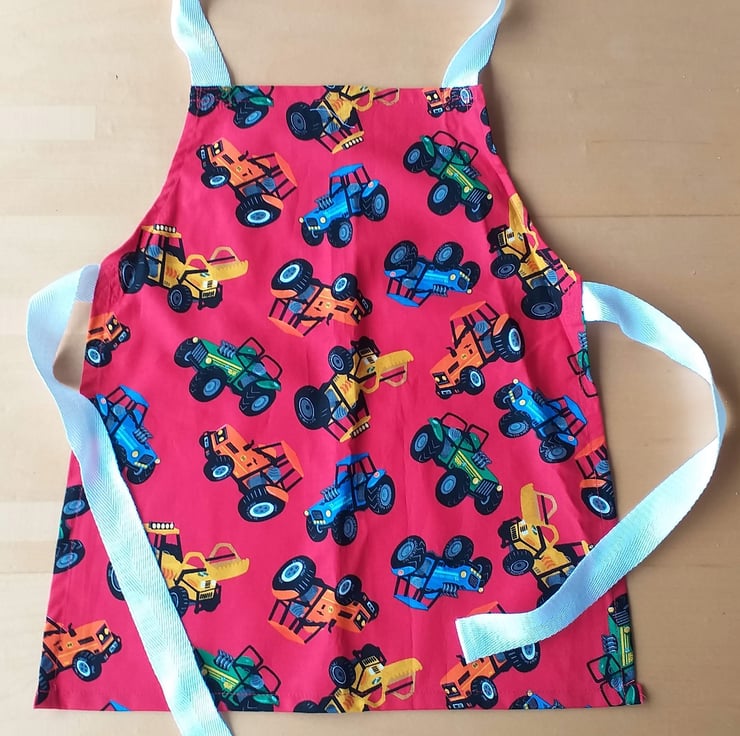This is a lovely red child's pinny with colourful tractors tossed all over it. (The vehicles may not appear in the same positions as in the illustration.) I have made it of a good quality machine washable cotton, with acrylic webbing straps. It measures approximately 17" (43 cms.)from neck to hem, and 14" (36 cms.) at the widest point, and will fit a child from about 2-6 years. The child demonstrating a different apron in the photo is three years old.