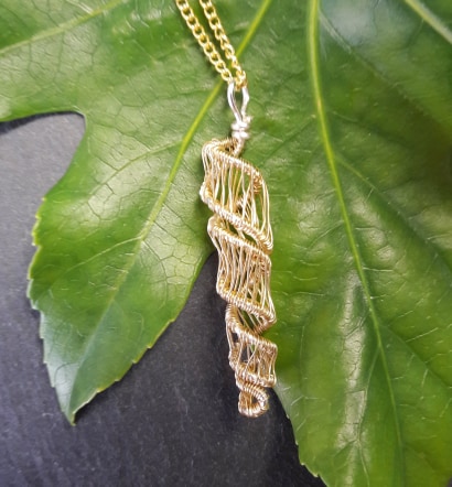 Once the length of wire has been woven in a basket style weave, it is then shaped around a mandrel to make the twisted shell shape.