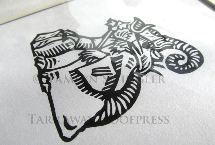 Water-based black, matte ink print on white 140 gsm paper, hand-hand pressed with a spoon and touched up by hand also to give it a consistent tone all over. Hand painted in acrylic ink.