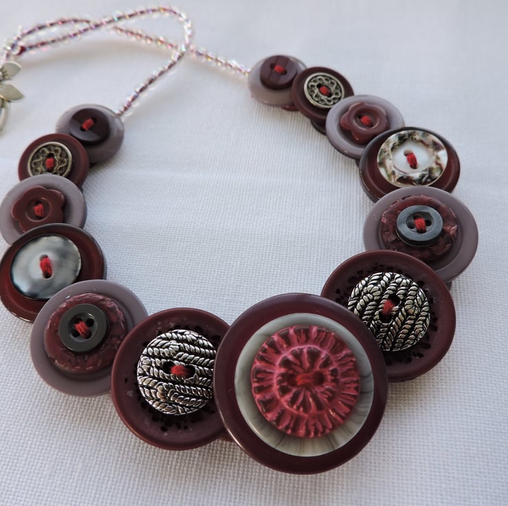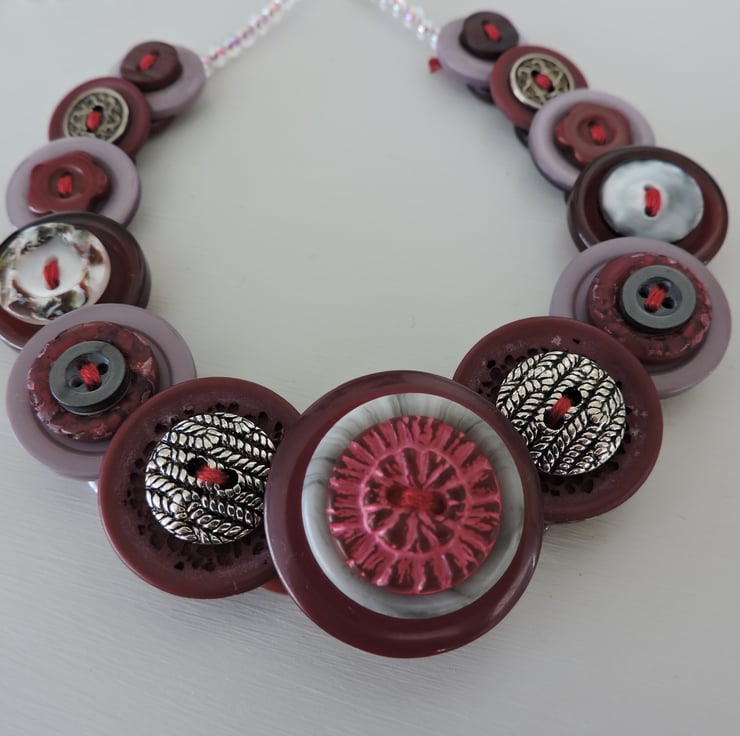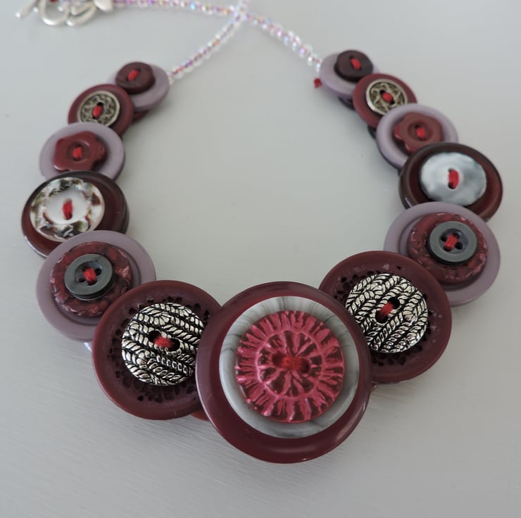 I've made this eye catching button necklace with an assortment of burgundy, magenta and grey buttons.