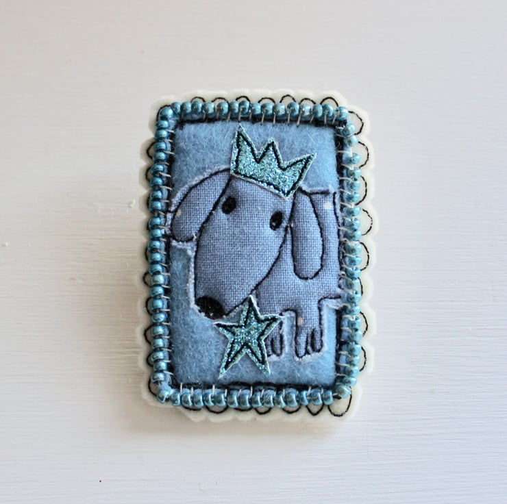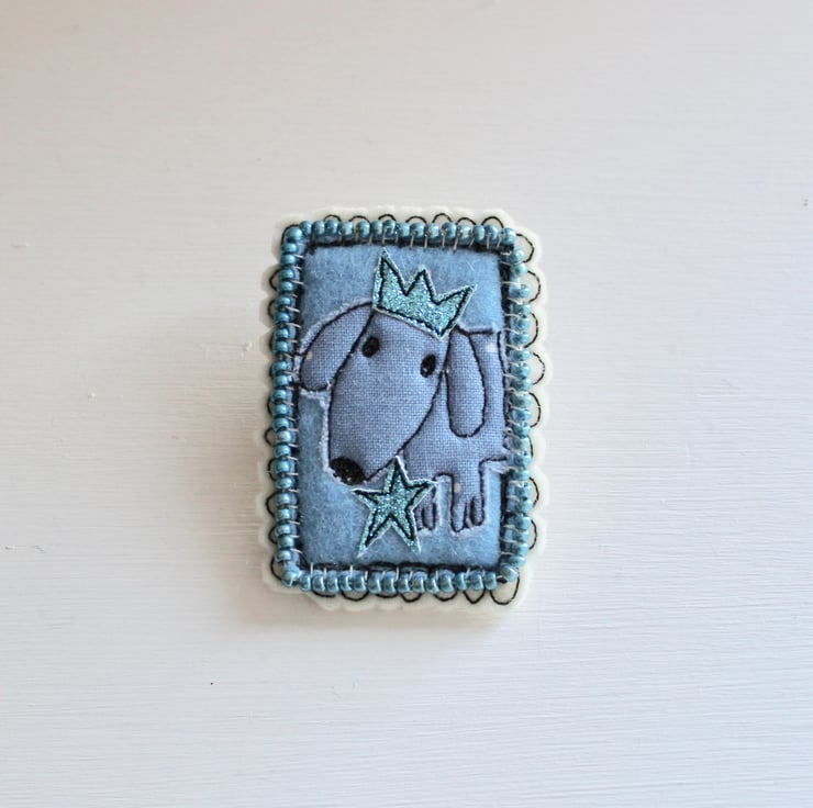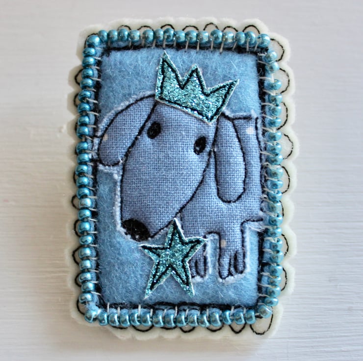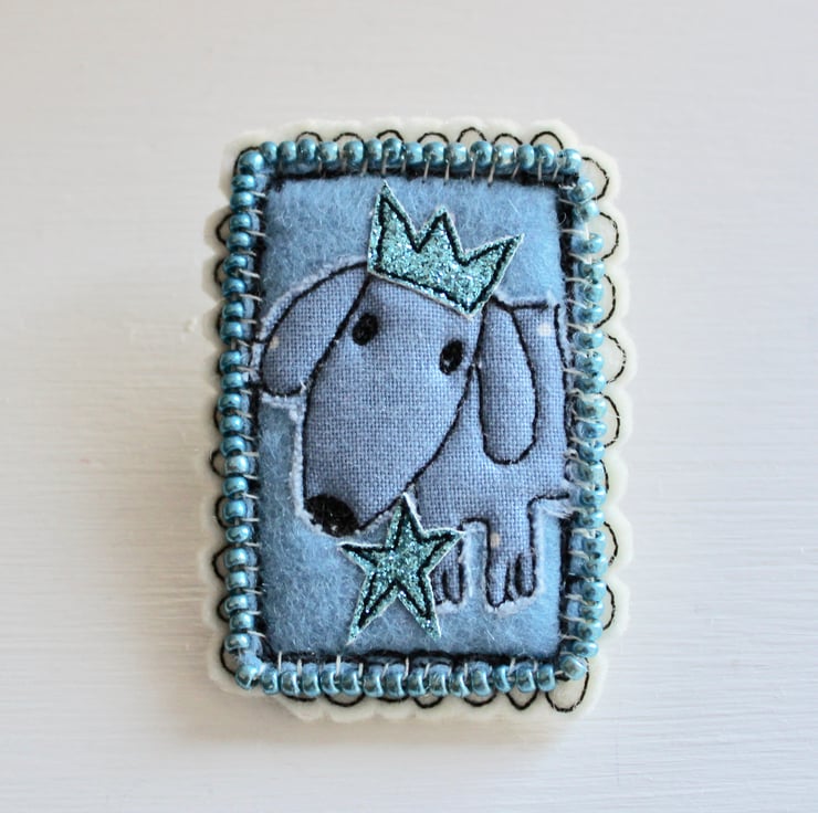 Doggy brooch is created using multiple layers of 100% wool felt, cotton cloth, glitter cloth and sewn using freehand machine embroidery. It is cut out by hand using a very sharp pair of scissors. There are hand sewn metallic blue seed beads, framing the doggy portrait.