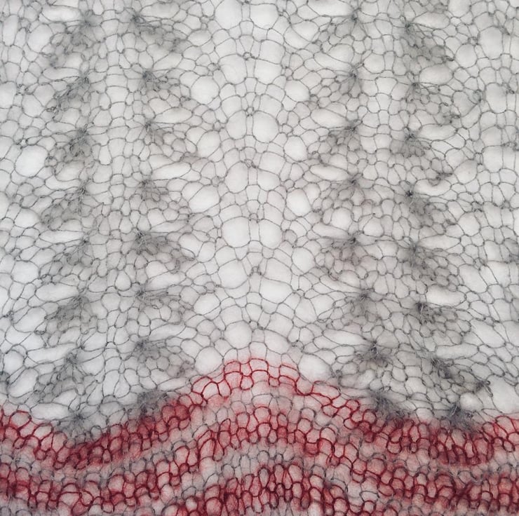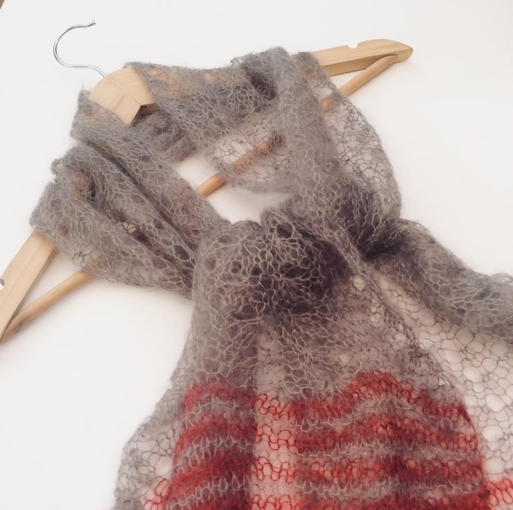 Taupe lace scarf hand knitted in kid silk haze yarn (mixture of kid mohair and silk). Wonderfully soft and knitted in an open lace pattern showing off 2 ruffles that run down the centre of the scarf. Slight curved edges to each end of the scarf with dark red stripes