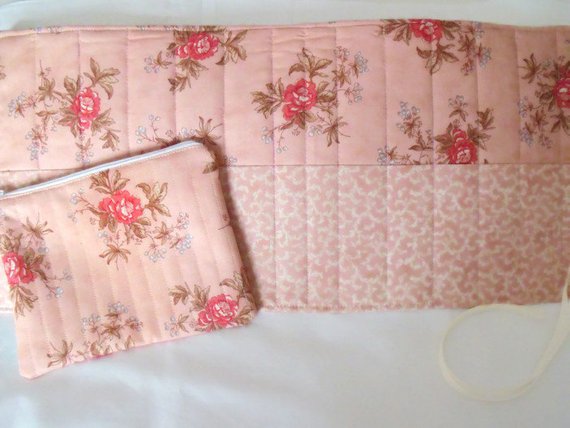 Make up brush roll is quilted using cotton wadding with cream grosgrain ribbon ties.
