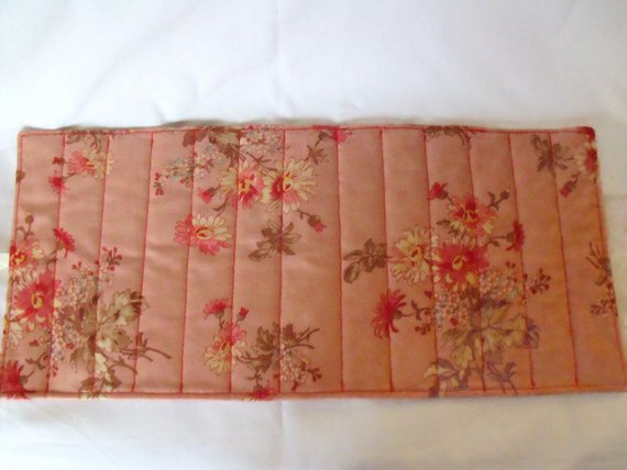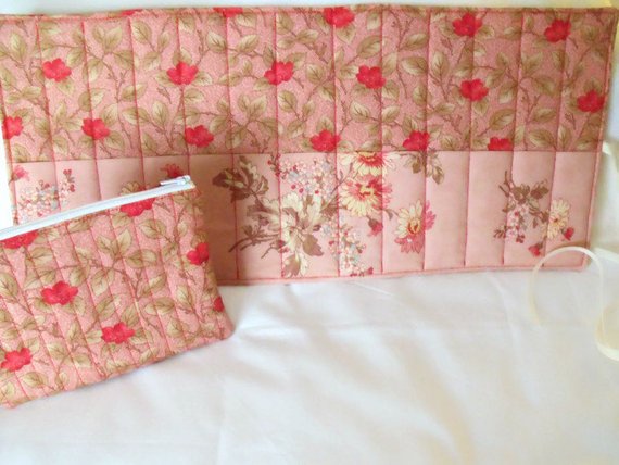 Make up brush roll is quilted using cotton wadding with cream grosgrain ribbon ties.