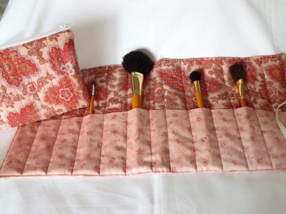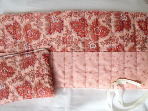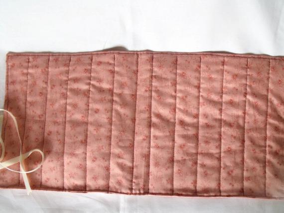 Make up brush roll is quilted using cotton wadding with cream grosgrain ribbon ties.