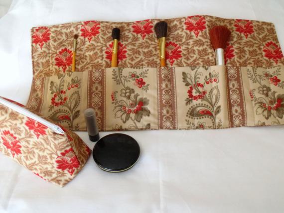 Make up brush roll is quilted using cotton wadding with cream grosgrain ribbon ties.