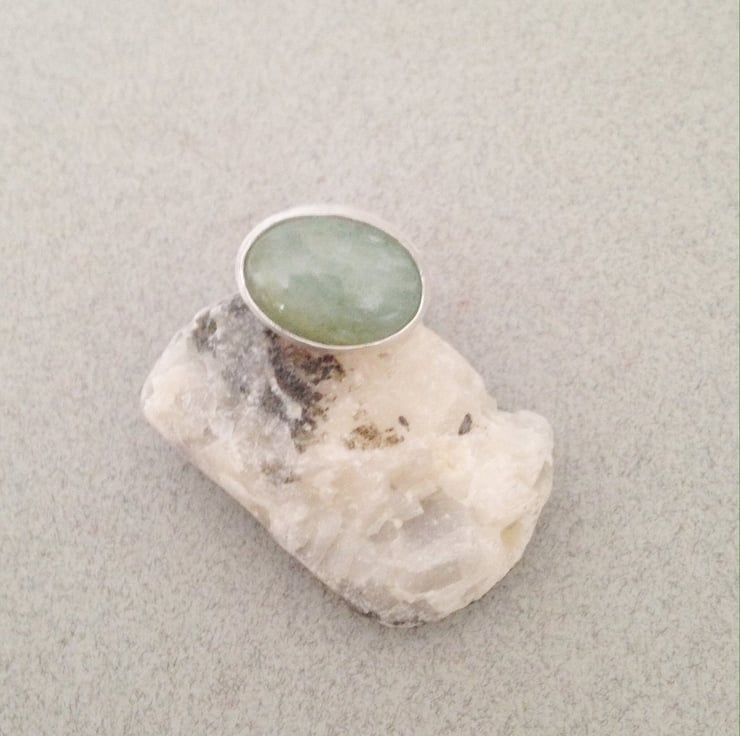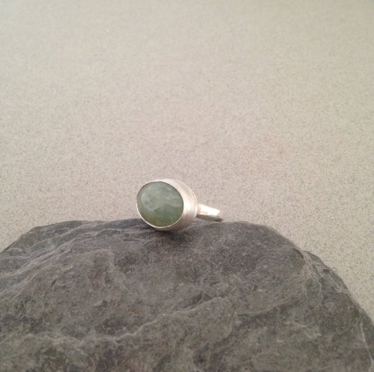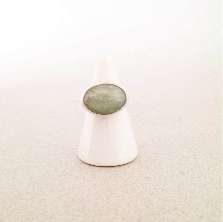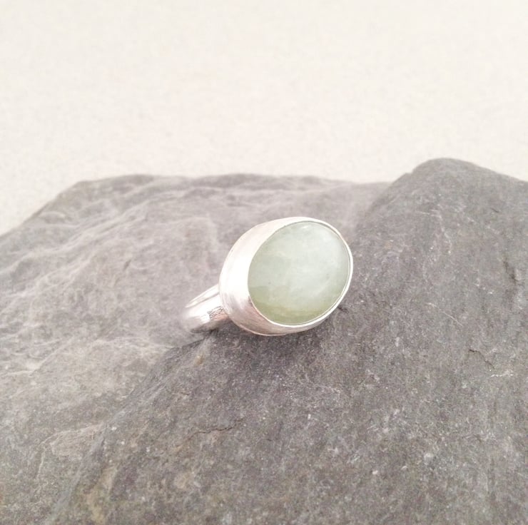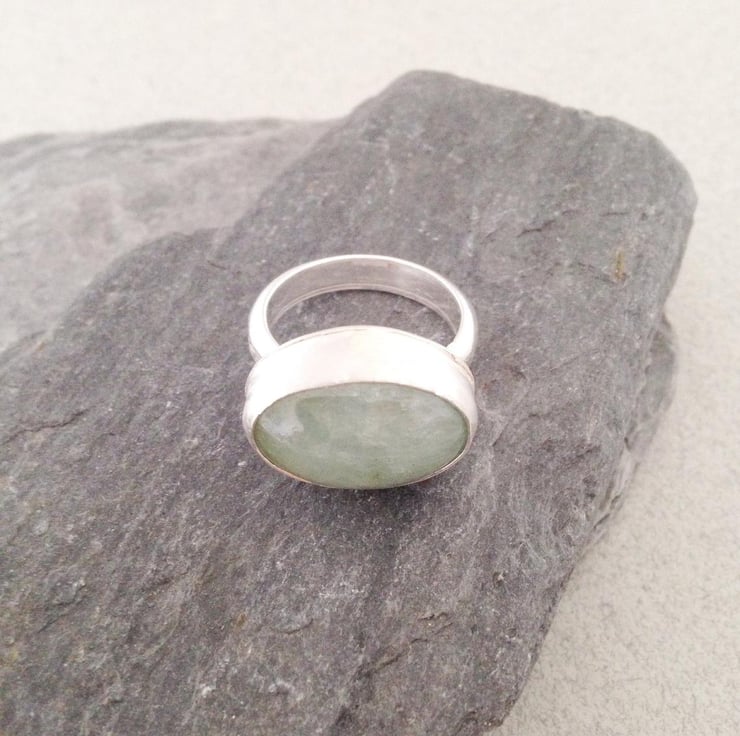 This listing is for a beautiful, pale green aquamarine ring. The stone measures 15x21mm and it is set in a sterling silver bezel. The ring shank is a chunky silver D shaped ring which measures 4x2mm. The D shaped ring makes this a substantial yet comfortable ring to wear.