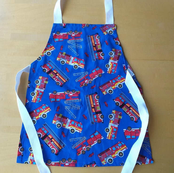 This is a lovely royal blue child's pinny with scarlet fire engines tossed all over it. (The vehicles may not appear in the same positions as in the illustration.) I have made it of a good quality machine washable cotton, with acrylic webbing straps. It measures approximately 17" (43 cms.)from neck to hem, and 14" (36 cms.) at the widest point, and will fit a child from about 2-6 years. The child, wearing a different apron in the photo, is three years old.