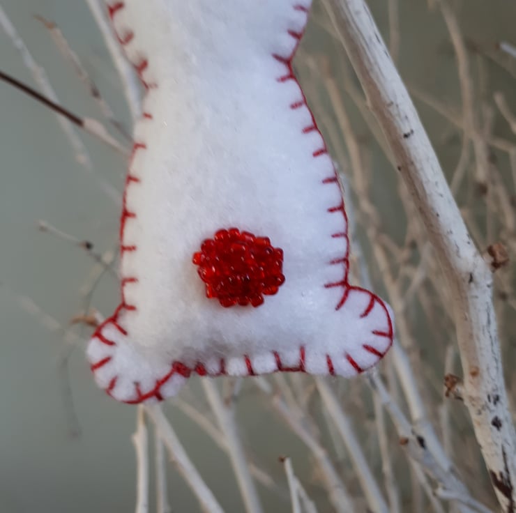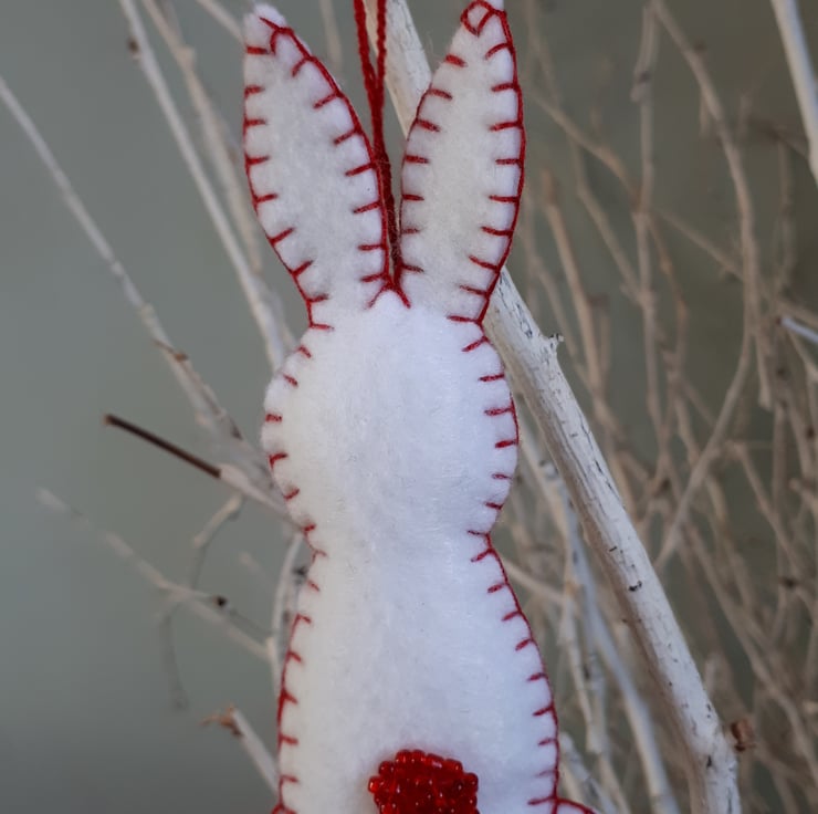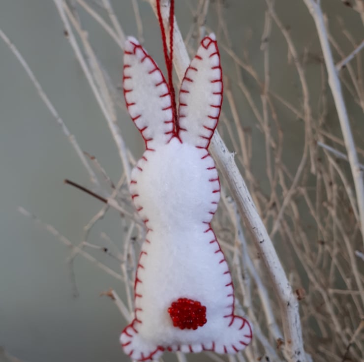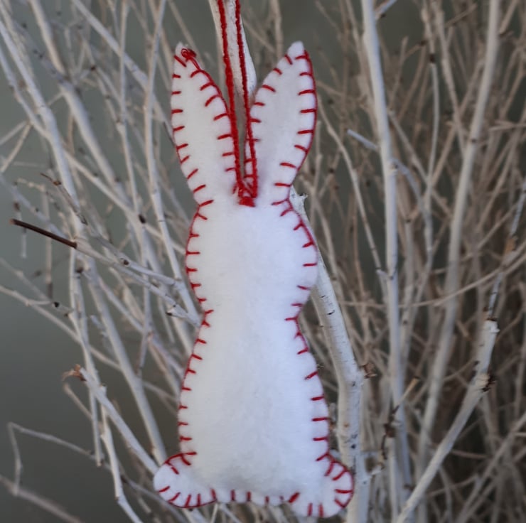 The Easter bunny rabbit measures 4" x 1 1/2" and is attached to a 2" white cord.