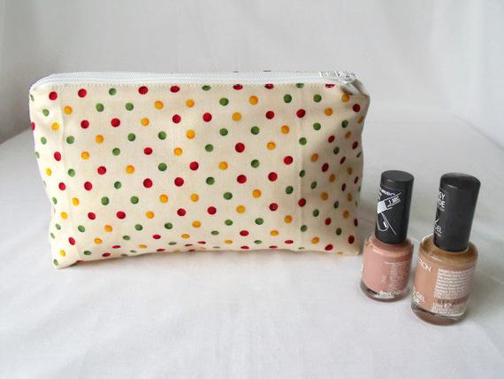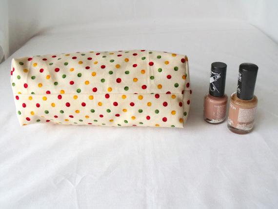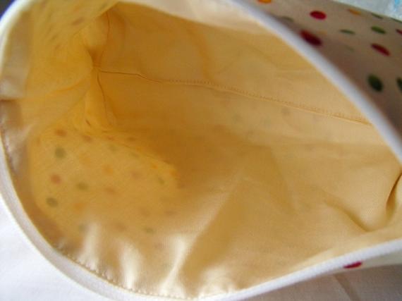 Sewn with cream polka dot cotton fabric.