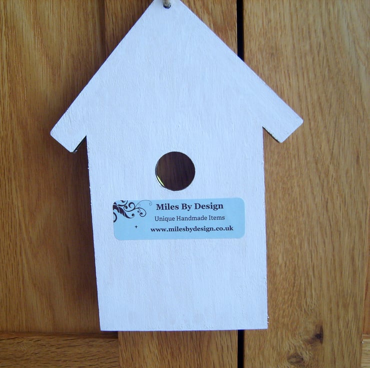 The wooden bird box shape has been painted white with a red roof. A scrolling vine design has also been hand painted to the front, finished with polymer clay flowers in an array of cheerful colours.