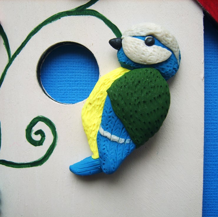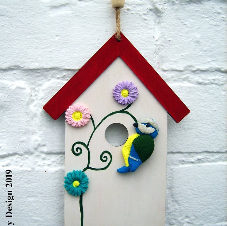 Bring a touch of spring inside your home with this pretty bird box hanging complete with handmade polymer clay Blue Tit and flower embellishments,