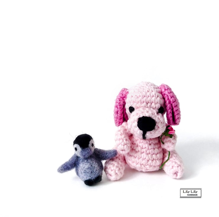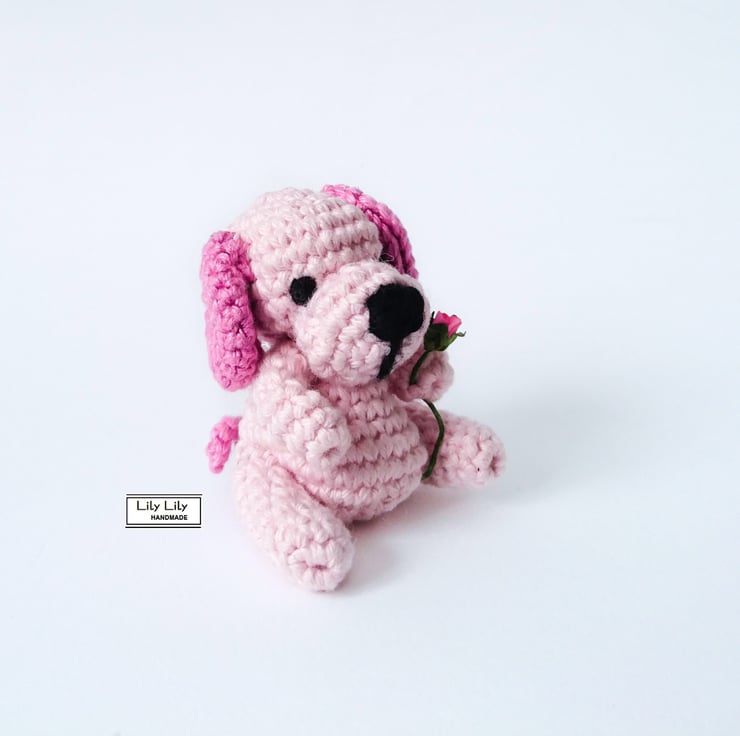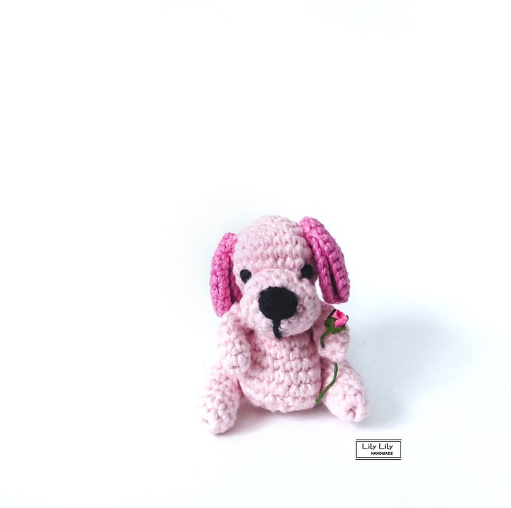 A miniature pink dog holding a pink rose bud handmade by Lily Lily Handmade. This cute amigurumi puppy dog has been crocheted using 100% cotton yarn. The eyes and nose have been embroidered using black embroidery thread. The ears and little tail have been crocheted using a co-ordinating dark pink cotton yarn.