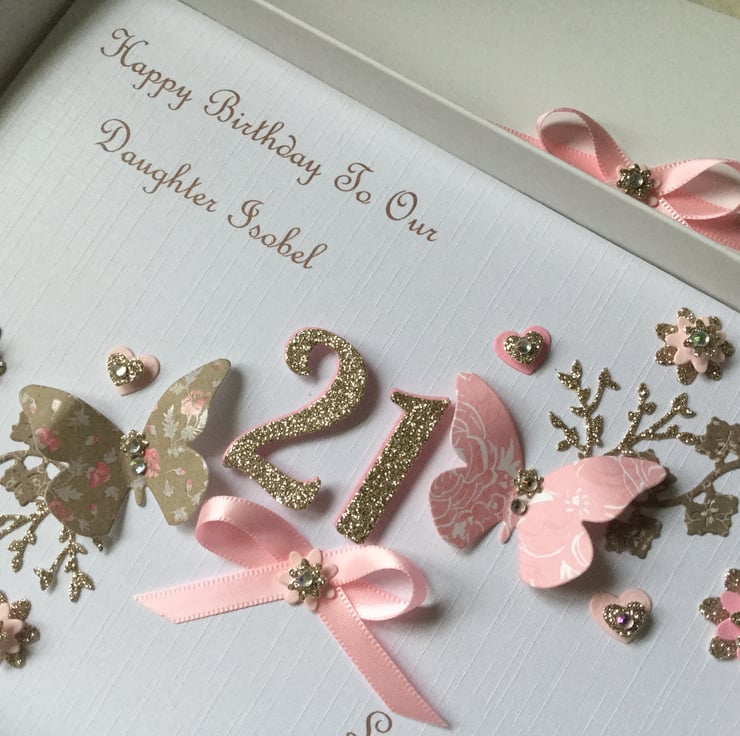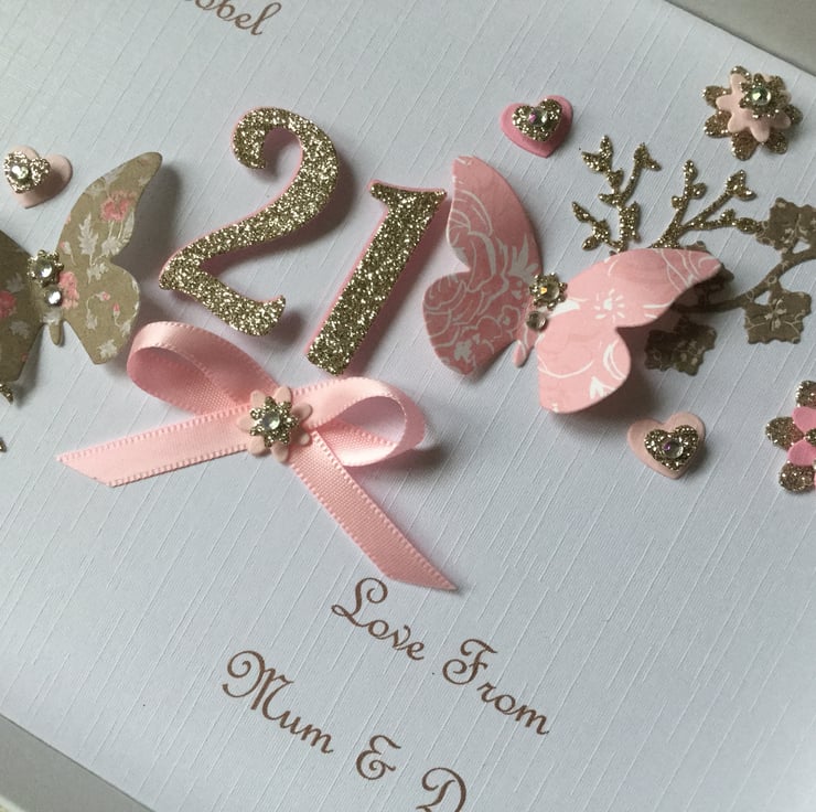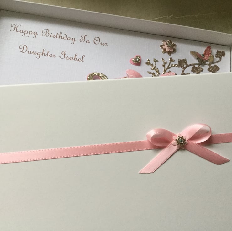 This handmade gift boxed card is A5 in size (210mm x 150mm) and can be personalised for any special birthday. It is on 300gsm cardstock and decorated with ribbons and gems. It comes in the matching decorated box and makes a wonderful keepsake.
