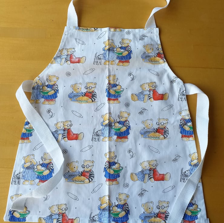 This is a delightful white pinny covered in teddy bears cooking pies - perfect for a small person to wear when helping Grandma in the kitchen. (The bears may not appear in the same positions as in the illustration.) I have made it of a good quality machine washable cotton, with acrylic webbing straps. It measures approximately 17" (43 cms.)from neck to hem, and 14" (36 cms.) at the widest point, and will fit a child from about 2-6 years. The child, wearing a different apron in the photo, is three years old.