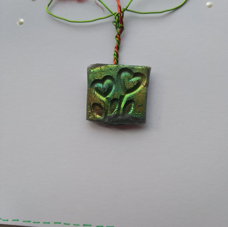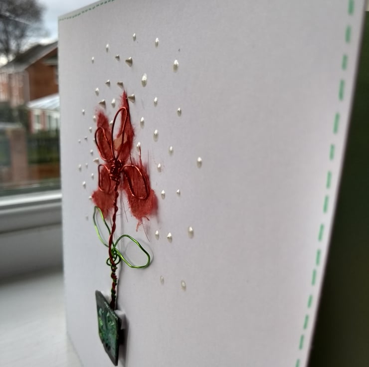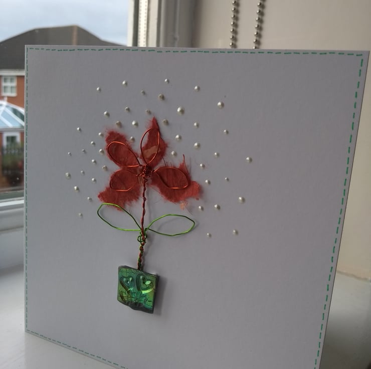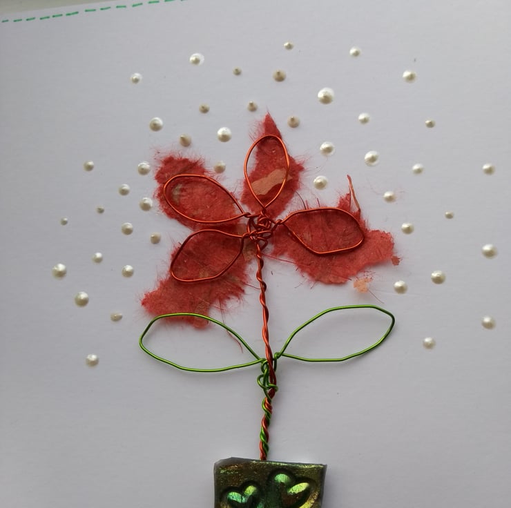 A completely handmade and uniquely designed card. Consisting of a flower and leaves made from wire with mulberry paper petals. Planted in a pot made from holographic meldable plastic with cute heart design embossed. Mounted onto quality pristine white card. Finished off with liquid pearl drips.