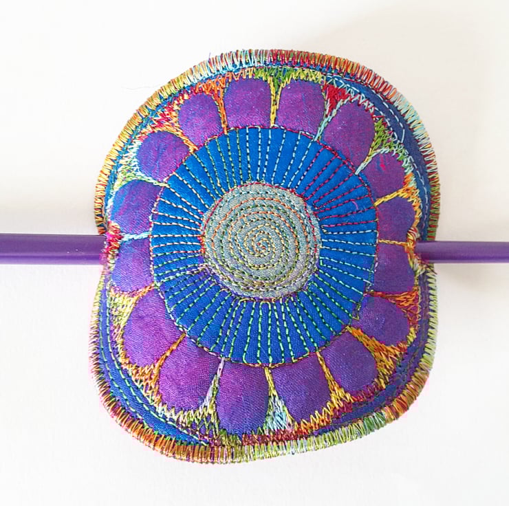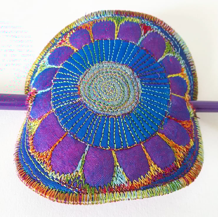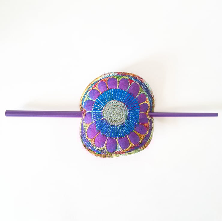 This is a handmade machine stitched fabric pony tail holder with a purple lacquered finish on the stick.