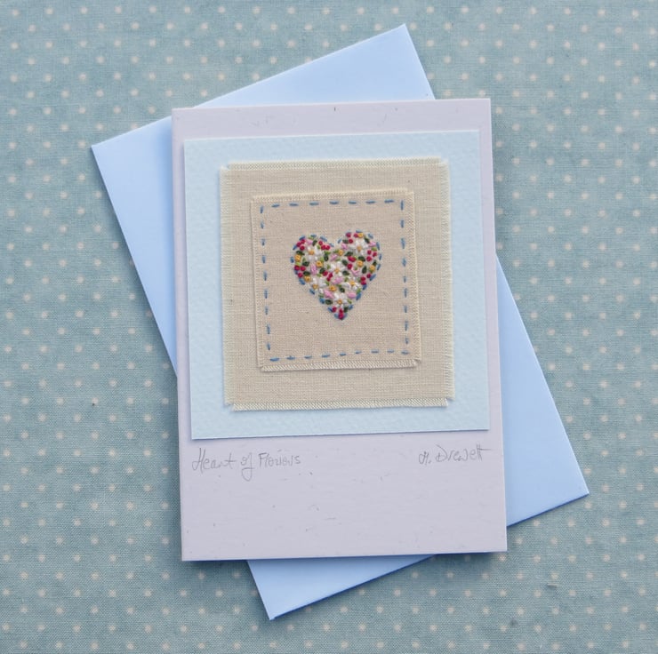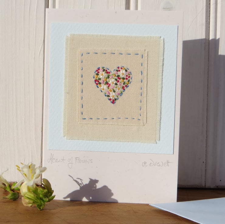 A hand-stitched miniature mounted onto greeting card, with title written beneath: Heart of Flowers. This carefully worked embroidered miniature is a gift in itself as well as a card in which to write your message - a card to keep. I have stitched a heart shape and filled it with colourful flowers. Delicate and precious-looking, perfect for any special time.