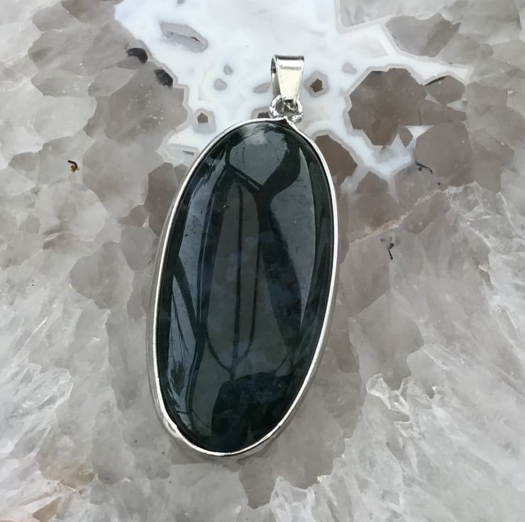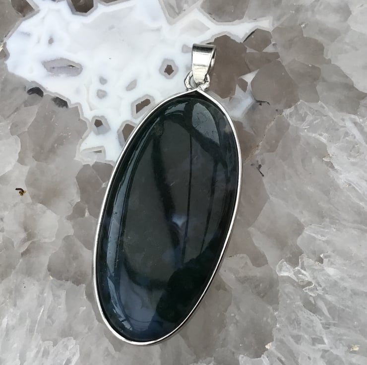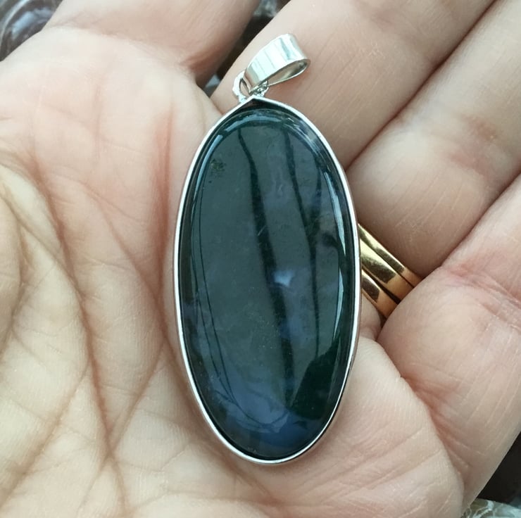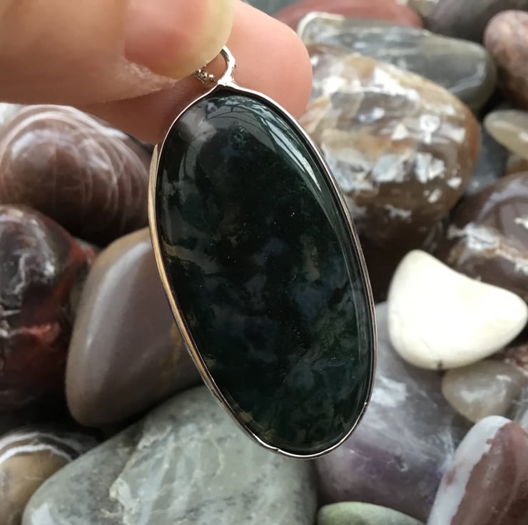 The Moss Agate in this long oval gemstone Cabochon is particularly beautiful, domed to the front and flat and highly polished all over, there is no front or back to this pendant. The Moss Agate is a beautiful deep miss green with translucent areas that Moss Agate is so well known for. Perfect for a lady or a gent, a unisex jewellery item.