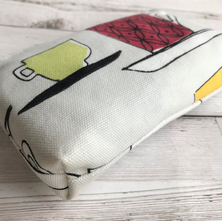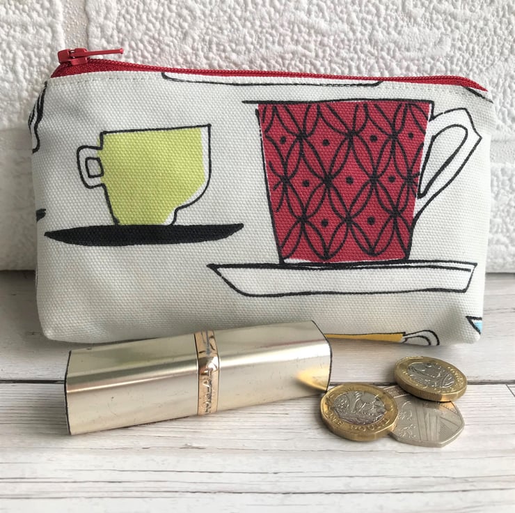 This large purse could be used as a coin purse and is large enough for bank cards and keys. It is also large enough to be used as a small make up bag or as a mobile phone pouch. With its characterful teacups pattern, it would make a lovely small gift, particularly for a tea or coffee lover.