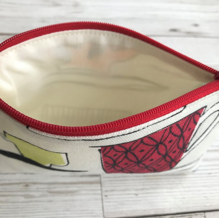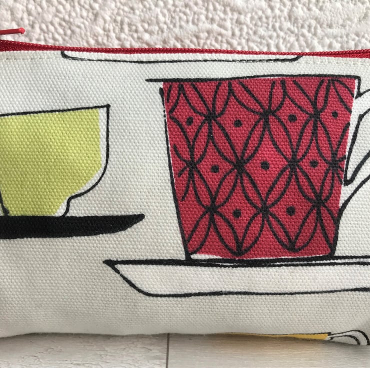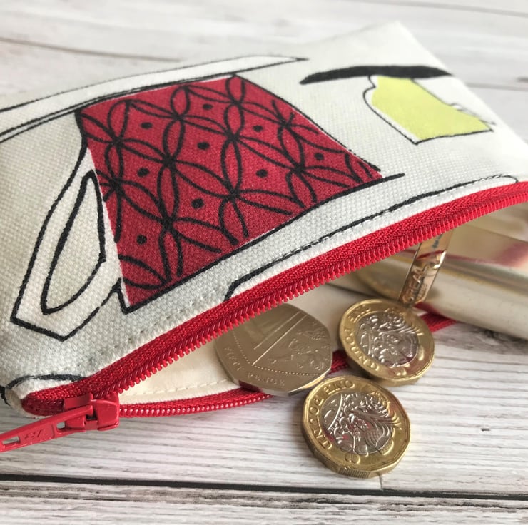 A quirky large coin purse in a fun print fabric featuring teacups and saucers on a cream background. The purse shows a large red cup with a black pattern and white handle and a black saucer. There is also a small lime green cup with a black saucer. The coin purse has a red zip and is lined with cream fabric. The base of the purse is boxed to give a spacious interior.