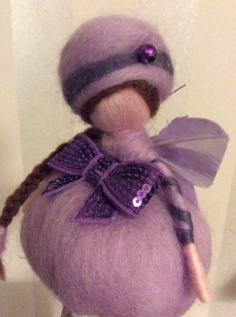 Meet Esme. She is a little needlefelted Ballerina Butterfly Fairy made from beautiful merino wool who stands at approximately 20cm. including her stand. She has a beautiful puff-ball dress in a lovely pale lilac colour with a big purple glitter bow at her waist. Esme ’s hat matches her dress in pale lilac with a purple band and bead decoration. Matching pale lilac tights with purple coloured merino wool in a criss-cross design and purple shiny coloured beads complete her outfit. She has a lovely long brown plait made from merino wool over one shoulder and her lilac butterfly Wings are made from feathers.