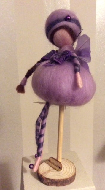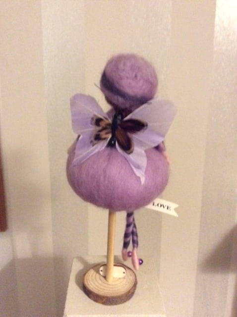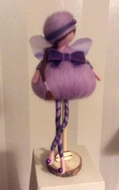 Meet Esme. She is a little needlefelted Ballerina Butterfly Fairy made from beautiful merino wool who stands at approximately 20cm. including her stand. She has a beautiful puff-ball dress in a lovely pale lilac colour with a big purple glitter bow at her waist. Esme ’s hat matches her dress in pale lilac with a purple band and bead decoration. Matching pale lilac tights with purple coloured merino wool in a criss-cross design and purple shiny coloured beads complete her outfit. She has a lovely long brown plait made from merino wool over one shoulder and her lilac butterfly Wings are made from feathers.