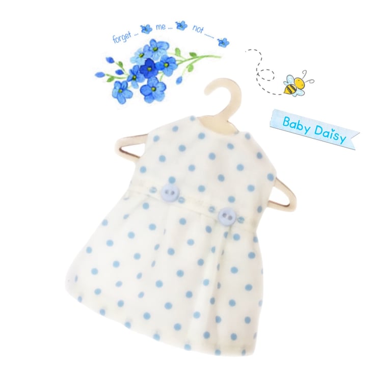 A cute little cream dress to fit Baby Daisy. The dress is in a blue spot print, has a lined bodice and fastens dawn the back with little poppers. It is decorated with two tiny blue buttons at the waist and comes with a tiny wooden hanger.