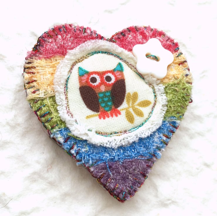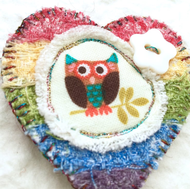 I made the heart-shaped rainbow by choosing five of my favourite colourful cotton fabrics and working them on my embellishing machine. This gives the cotton fabrics a 'distressed' look and brings their colours to a softer, subtler tone - the perfect backdrop for this little feathered dreamer. I've cut a little piece of off-white linen the same size as my owl cutting, and have gently distressed the edges of the two fabrics to add to the rustic style. I've then stitched the owl into place with shimmering pastel-coloured rainbow thread. Finally the smooth creamy-coloured star has been added and I have hand-stitched the brooch together with the shimmering rainbow thread.