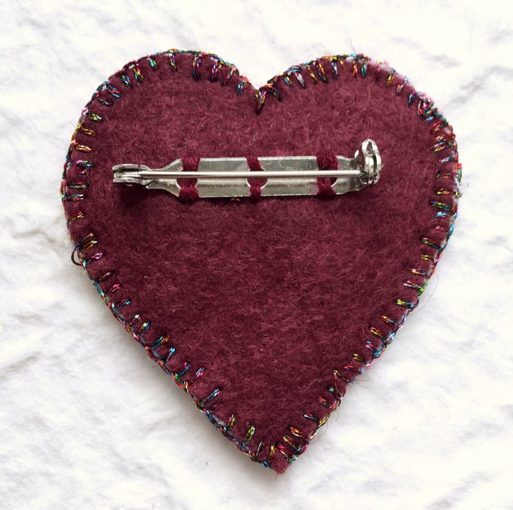 The back of this brooch is burgundy felt. This brooch measures 5.5cm wide and 5.5cm high.