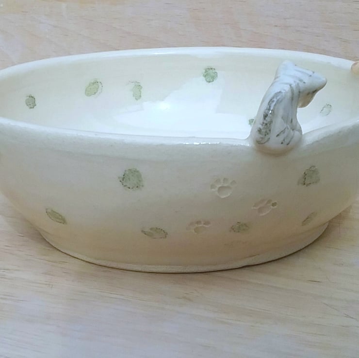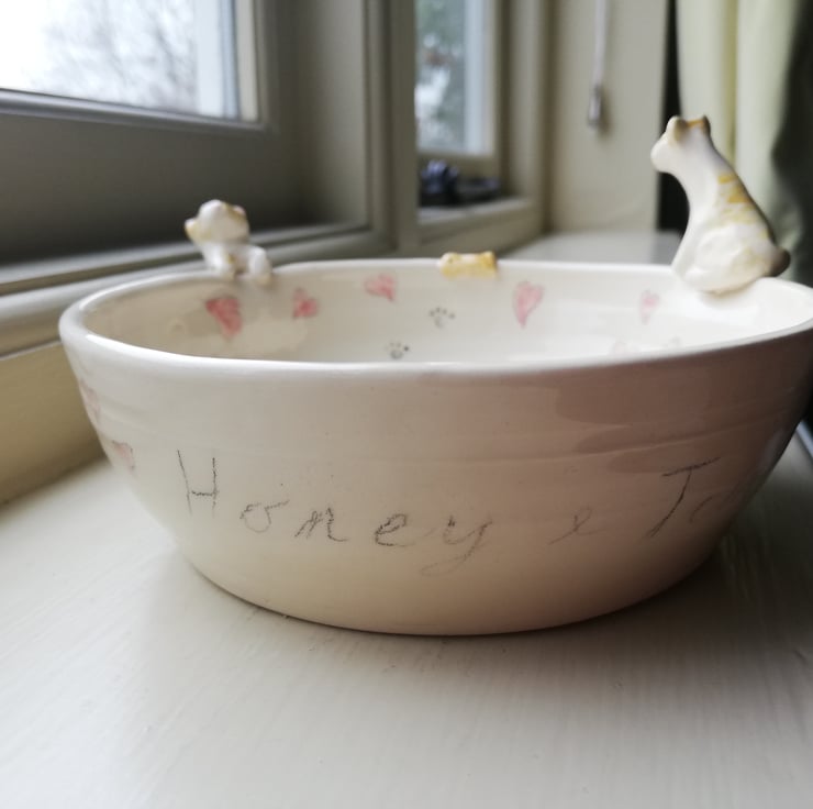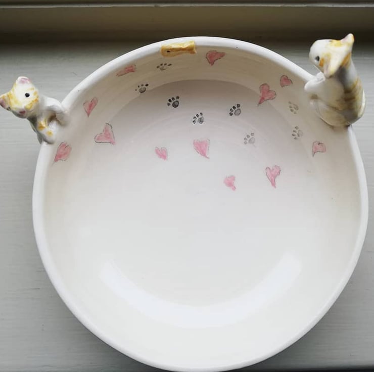 Ceramic hand thrown cat feeder with a choice of cat or 2 cats hand painted from photographs. With footprints and a choice of hearts, stars or dots in any colour.