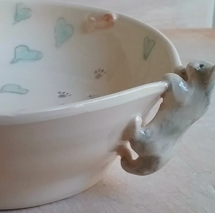 I have recently acquired a little rescue cat and wanted to make her a special personalised bowl and because pet bowls are always on display I thought it would look rather fetching with a miniature version of her on the side .