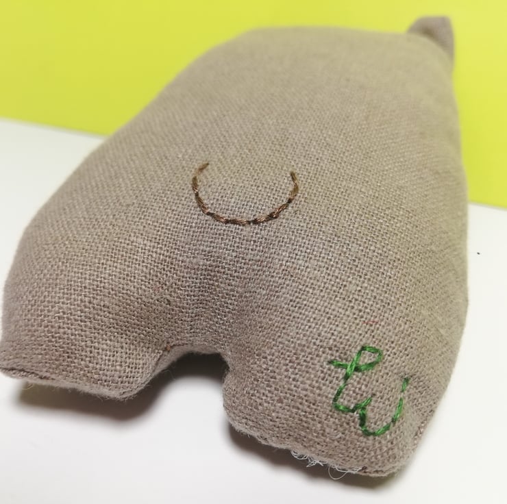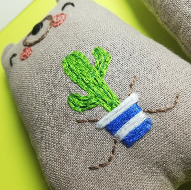 Little soft linen bear with hand embroidered details including swirly cheeks, nose and eyes. The cactus is in a stripey blue and white pot, there's a cute little tale to the rear too. This sweet little character would look great as decoration and would make a thoughtful gift too. These hand embroidered bears are all one of a kind pieces, the design process and embroidery are lengthy but the finished bear is so worth it.