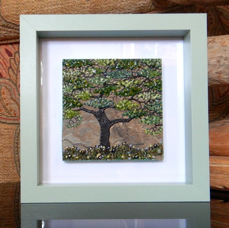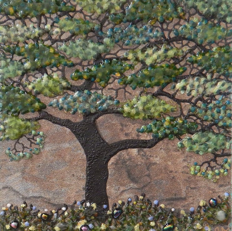 This little picture is a combination of textured ceramic and fused glass. It is a slight deviation for me as it is the first time that I have combined my glasswork with a ceramic background.