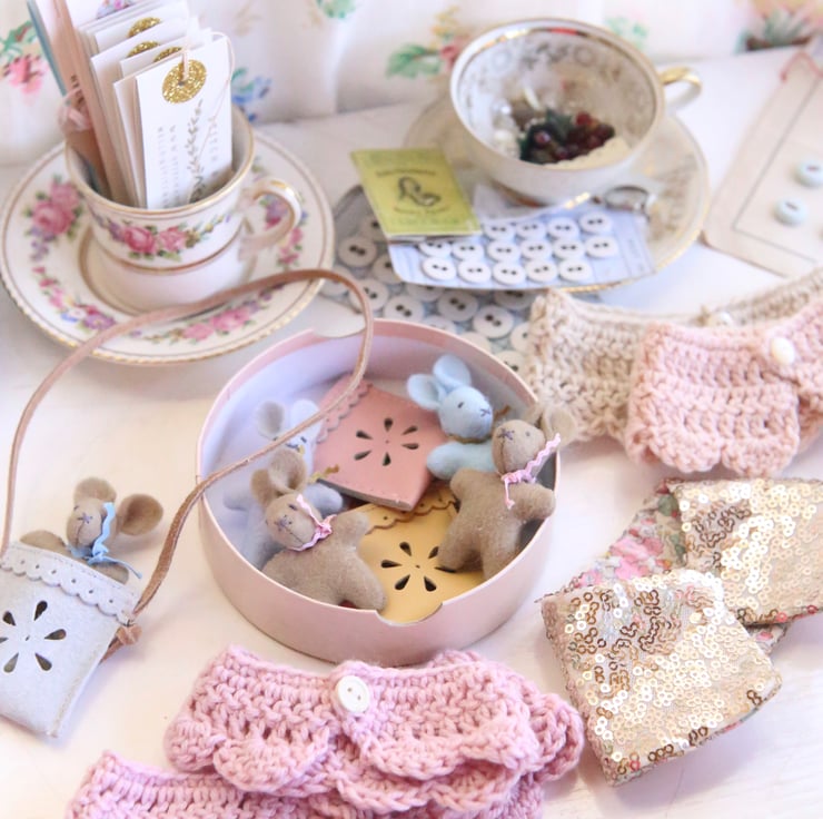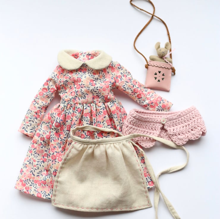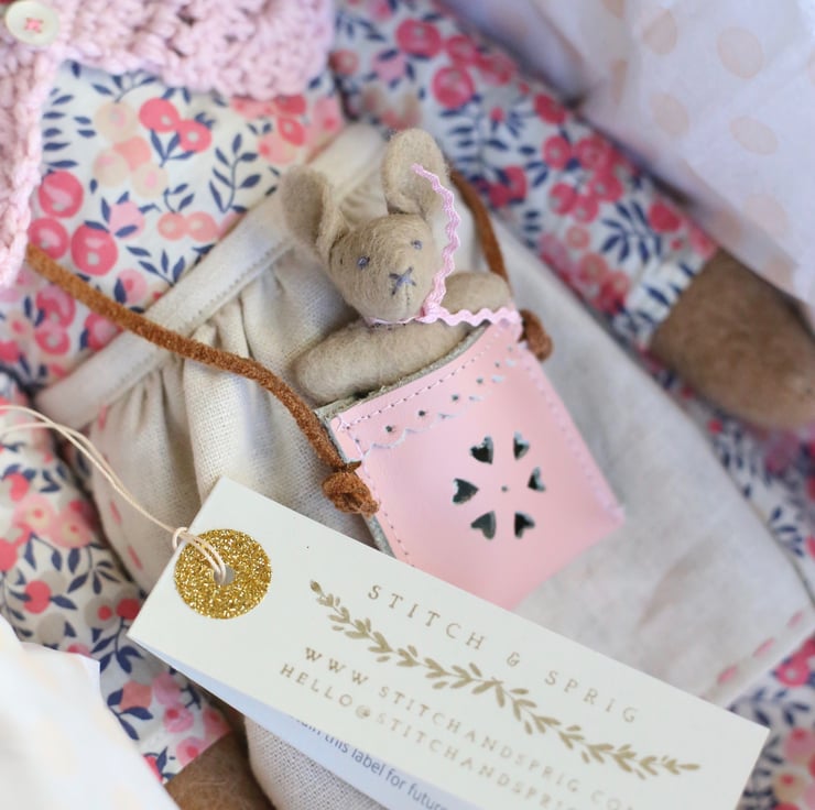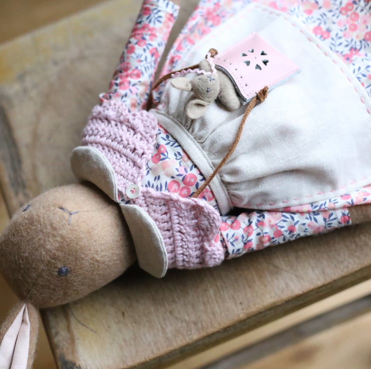 She has a removable dress made from beautiful Liberty of London Tana lawn fabric in Wiltshire Berry pink, with a little Peter Pan collar made from linen/cotton. Her embroidered apron is stitched by hand with a co-ordinating running stitch and can be personalised with a name or initial. She has a little pink leather bag containing a tiny baby bunny. A choice of heart or daisy design is available.