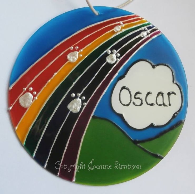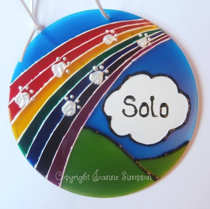 All sun catchers are hand painted by me from my own design. As each one is hand painted they are all as individual as your pet. A single name, upto seven letters, can be added to the cloud and the paws going over the bridge are pearl coloured. Hanging thread colour may vary.