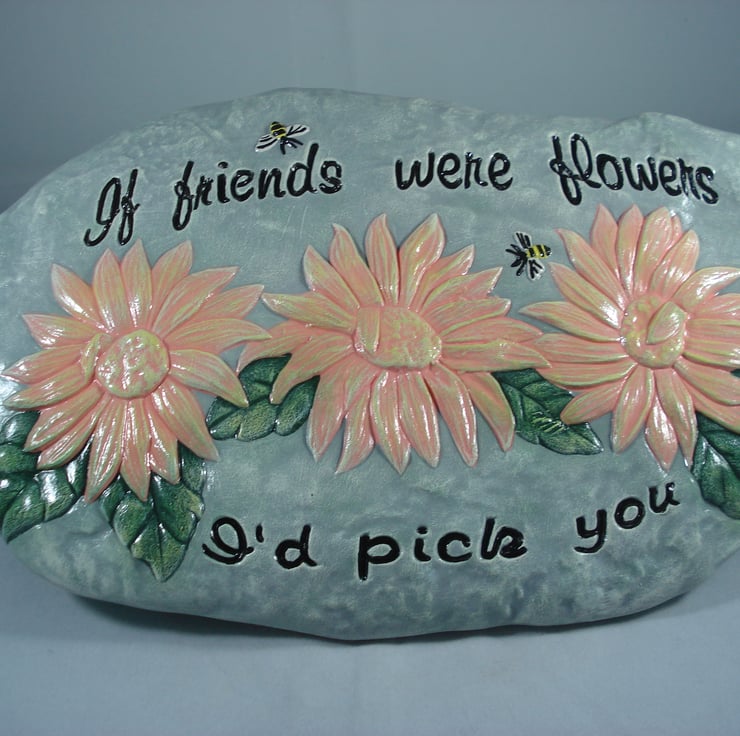 I have for sale a ceramic wall plaque, which was hand painted by myself. It looks like a piece of grey coloured stone, with some lovely flowers and a couple of bumble bees on it, also the words 'If Friends Were Flowers I'd Pick You', engraved either side of the flowers. This would make a lovely keepsake gift.