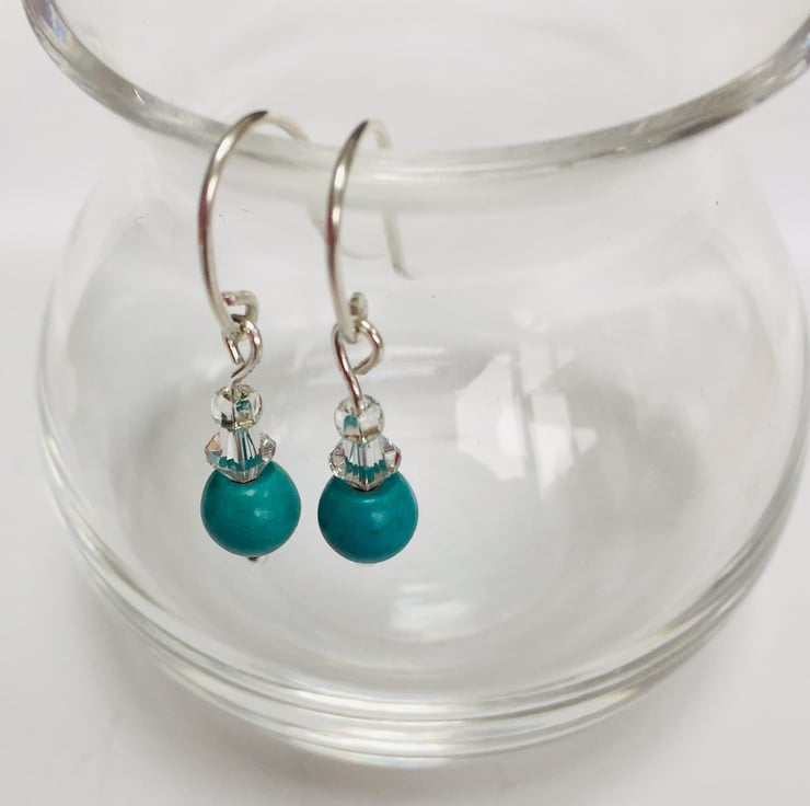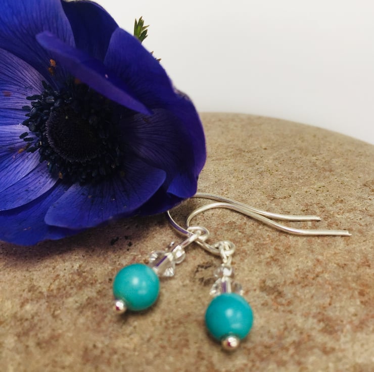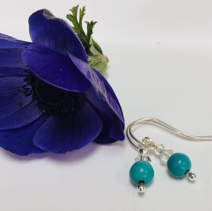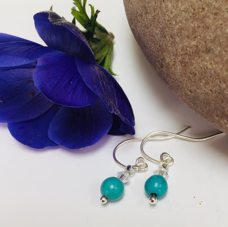 These pretty earrings are made from sterling silver with turquoise blue turquenite (howlite) gemstones and Swarovski crystals. They have handcrafted sterling silver fittings. The perfect gift for any occasion.