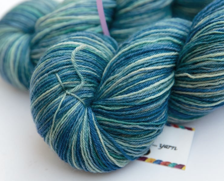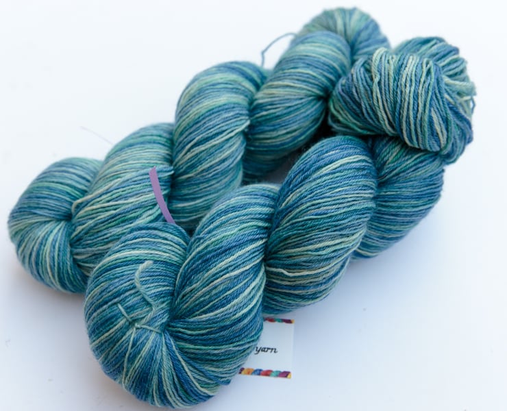 Shades of blue, aqua and light grey-blue. This Bluefaced Leicester superwash yarn is soft with a very slight lustre. Photos taken and edited in bright natural light. There are two skeins available (price shown is for one).