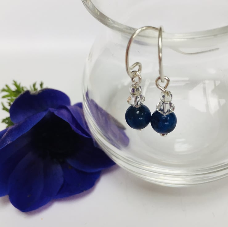These pretty earrings are made from sterling silver with deep blue sodalite gemstones and Swarovski crystals. They have handcrafted sterling silver fittings. The perfect gift for any occasion.