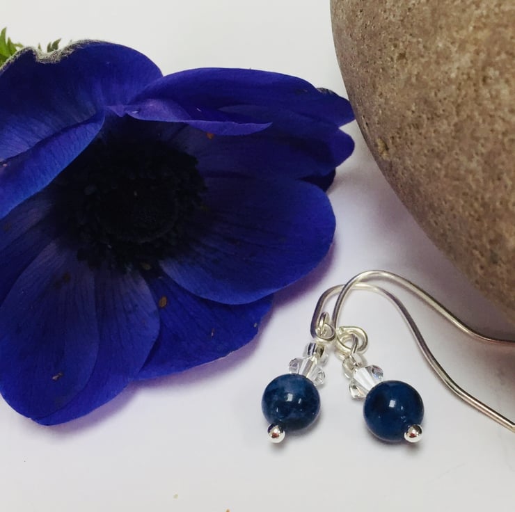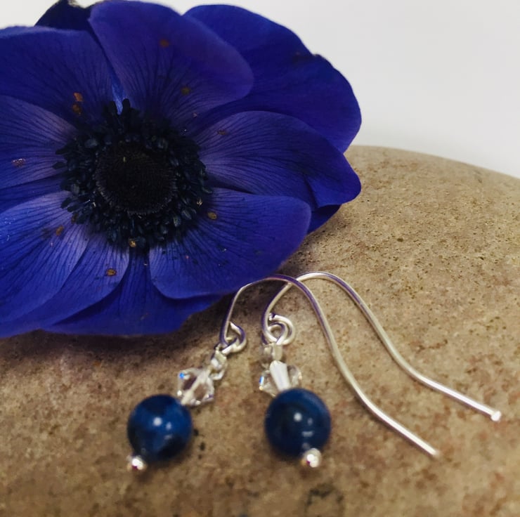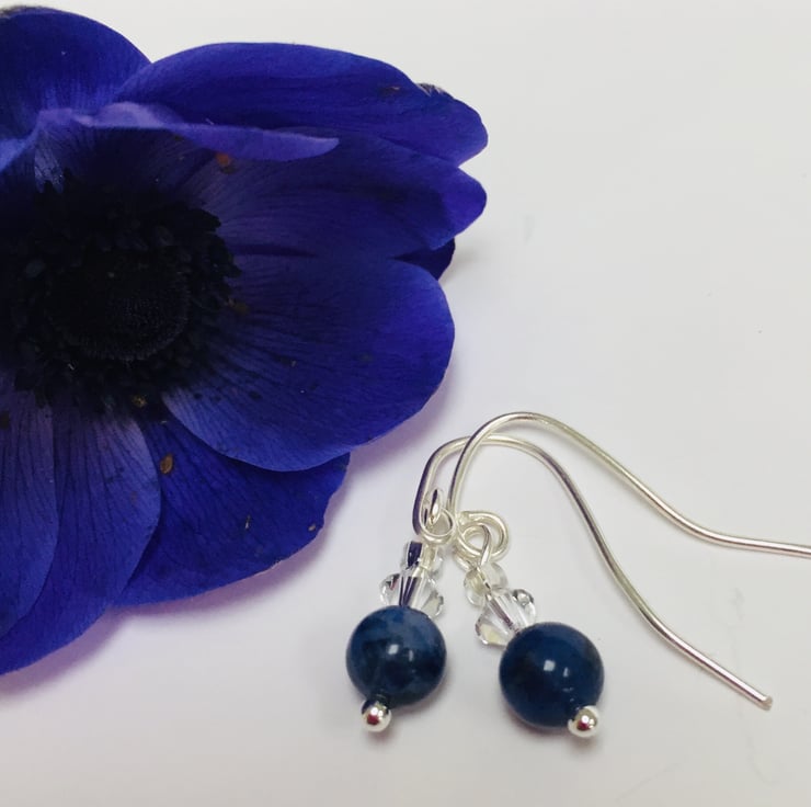 These pretty earrings are made from sterling silver with deep blue sodalite gemstones and Swarovski crystals. They have handcrafted sterling silver fittings. The perfect gift for any occasion.
