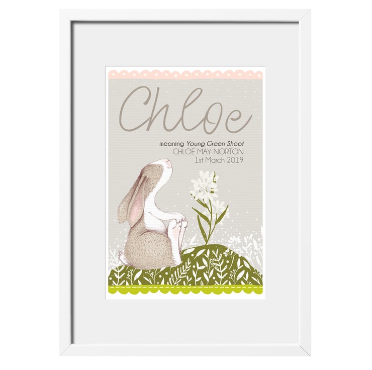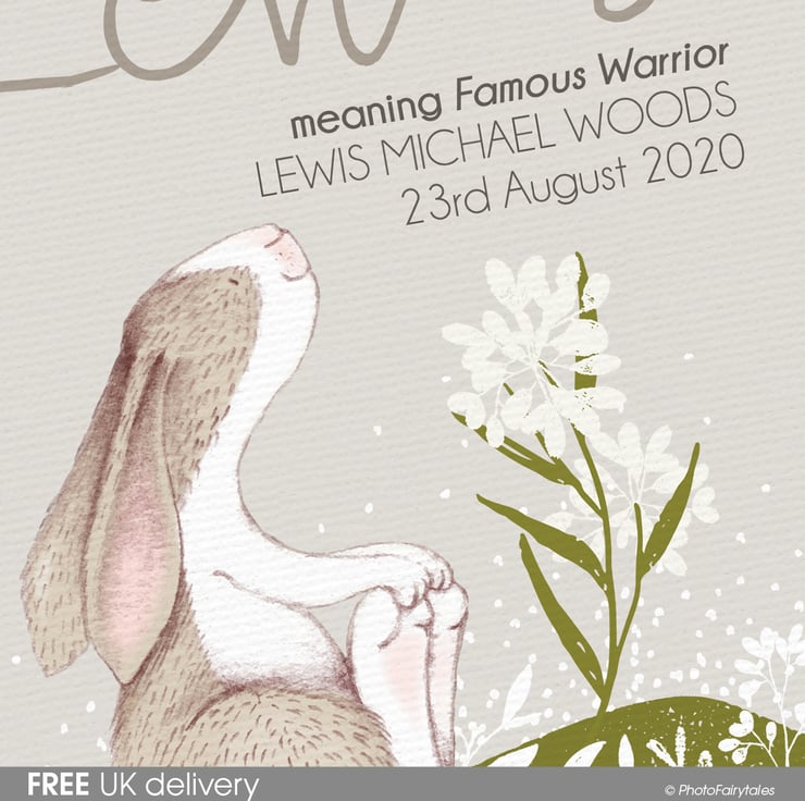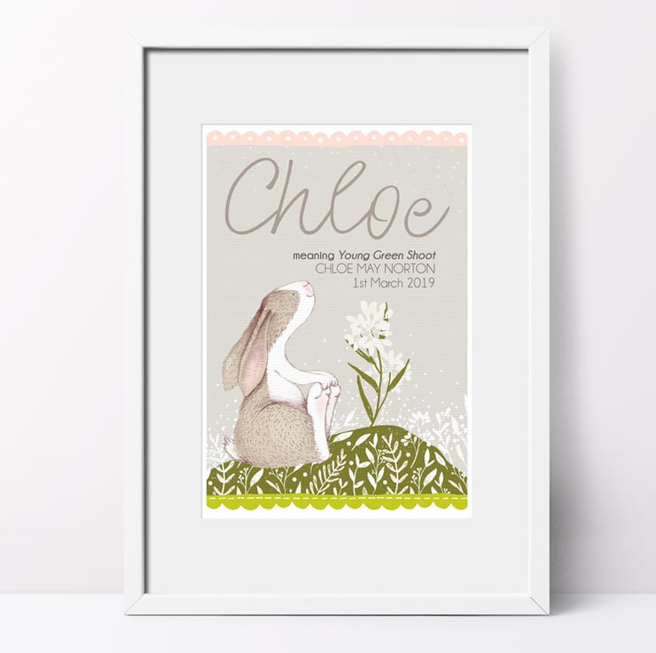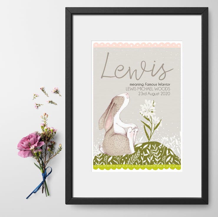 This Little Hare personalised name print is a beautiful gift for a newborn. Perfect to celebrate a christening or naming day, a special birthday, or just a gorgeous print for the nursery. Featuring an adorable illustration, this sweet and whimsical personalised print features your baby’s full name, the meaning of their first name, and their date of birth. Just supply the name & date and I will research the meaning for you and add it to this sweet nursery print.