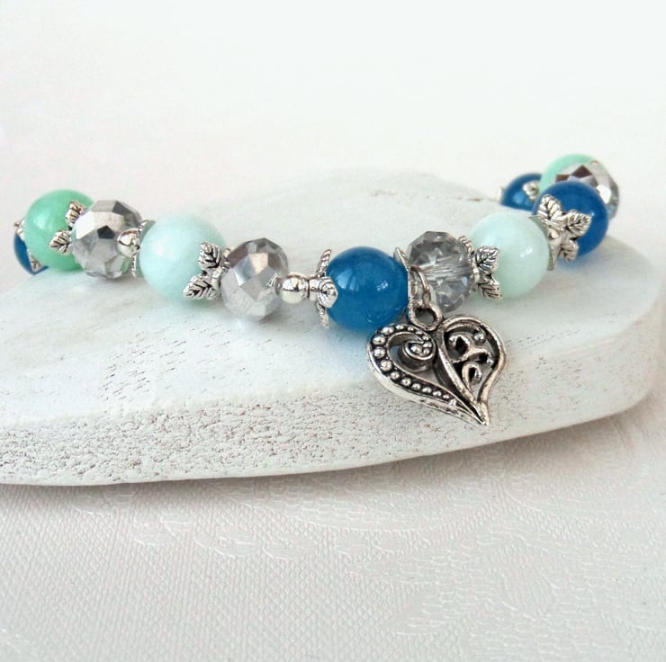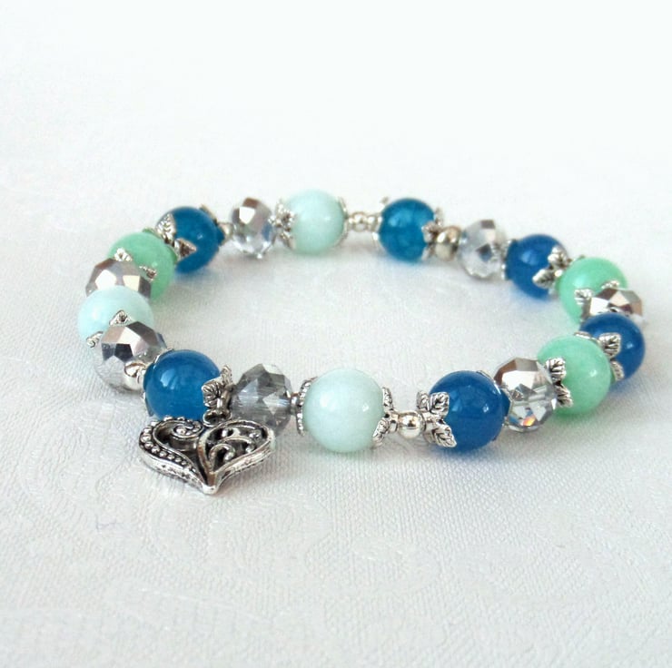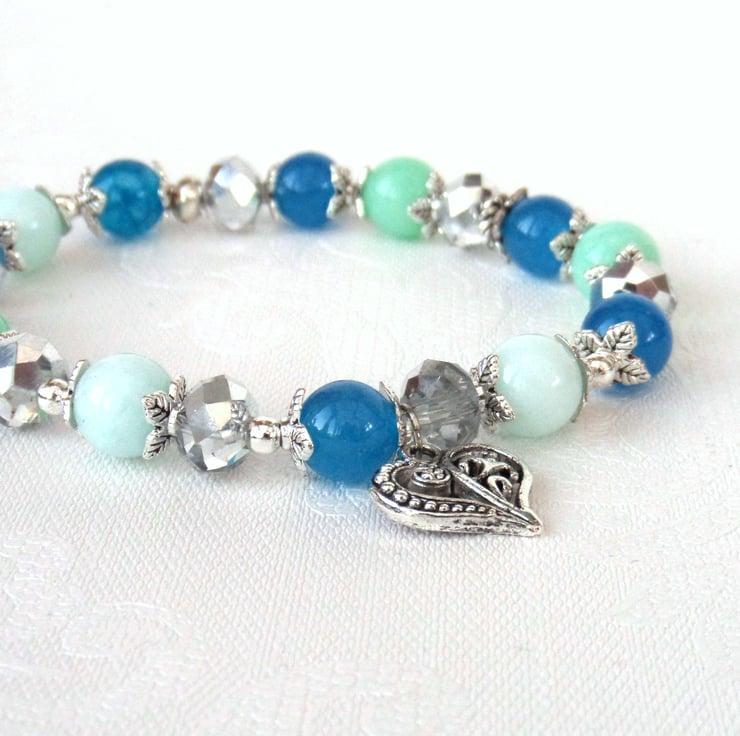This gemstone bracelet is made with a mix of colours and stones - blue and pale green jade, turquoise green quartz, silver crystal and tibetan silver beads.