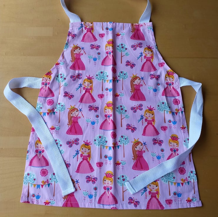 This is a lovely pink child's pinny with gorgeous princesses all over it. (They may not appear in the same positions as in the illustration.) There are butterflies, flowers and lines of bunting interspersed between them. I have made it of a good quality machine washable cotton, with acrylic webbing straps. It measures approximately 17" (43 cms.)from neck to hem, and 14" (36 cms.) at the widest point, and will fit a child from about 2-6 years. The child wearing a different pinny in the photo is three years old.